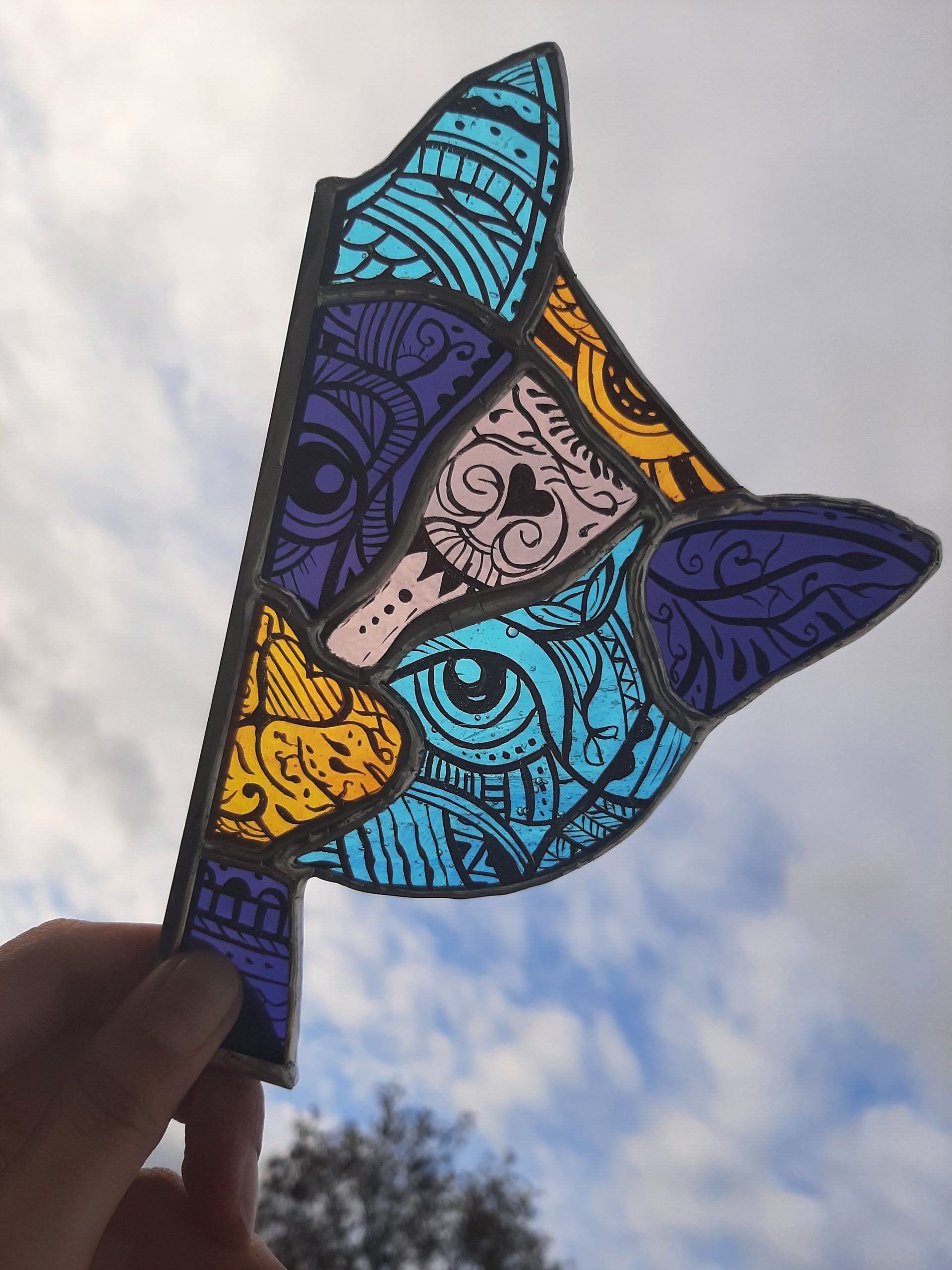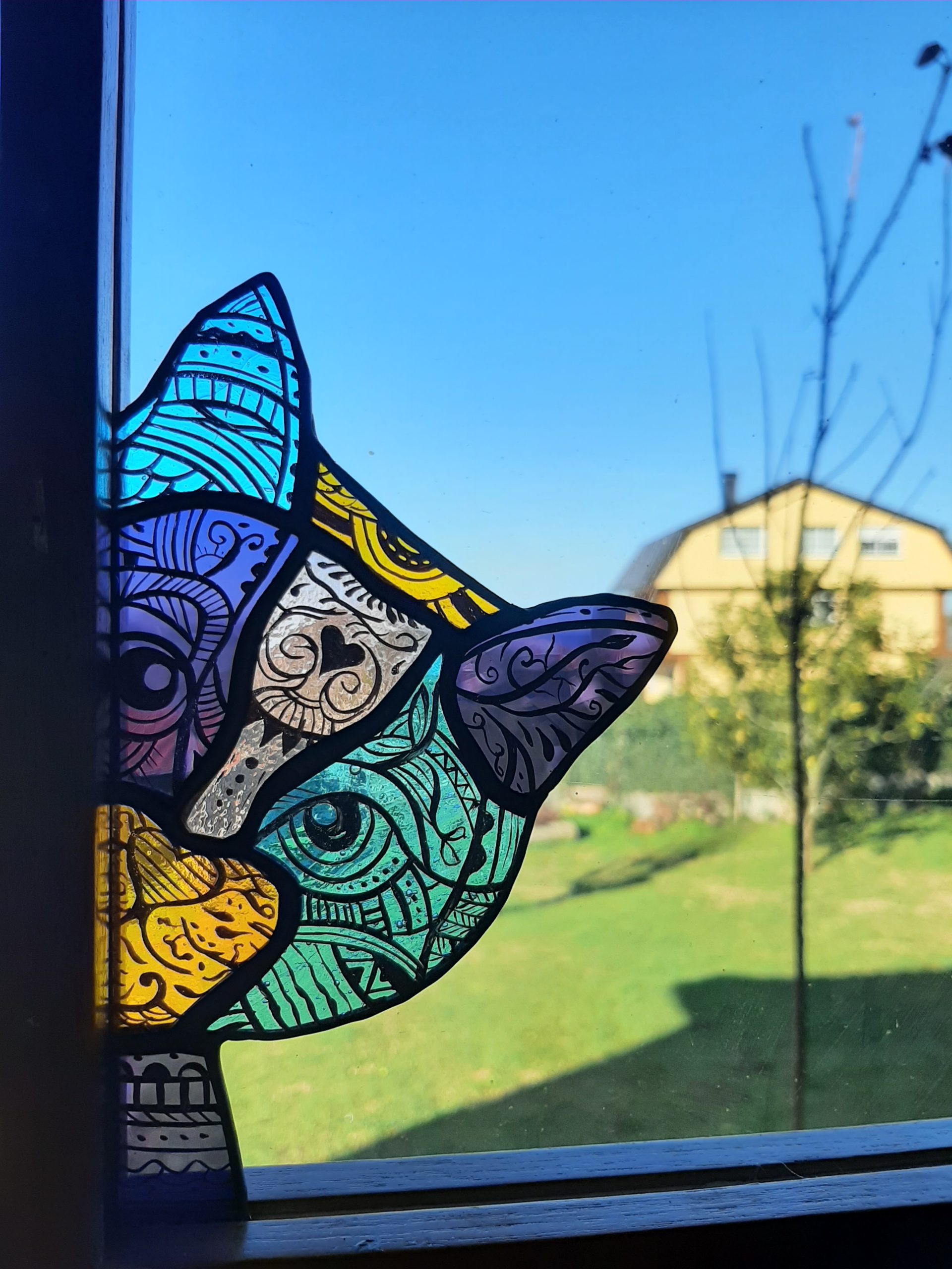Este divertido gatito decorado es perfecto para los amantes de los gatos, ya que es único. Esta pieza de vidrio puede ser una excelente decoración para cualquier ventana o puerta.