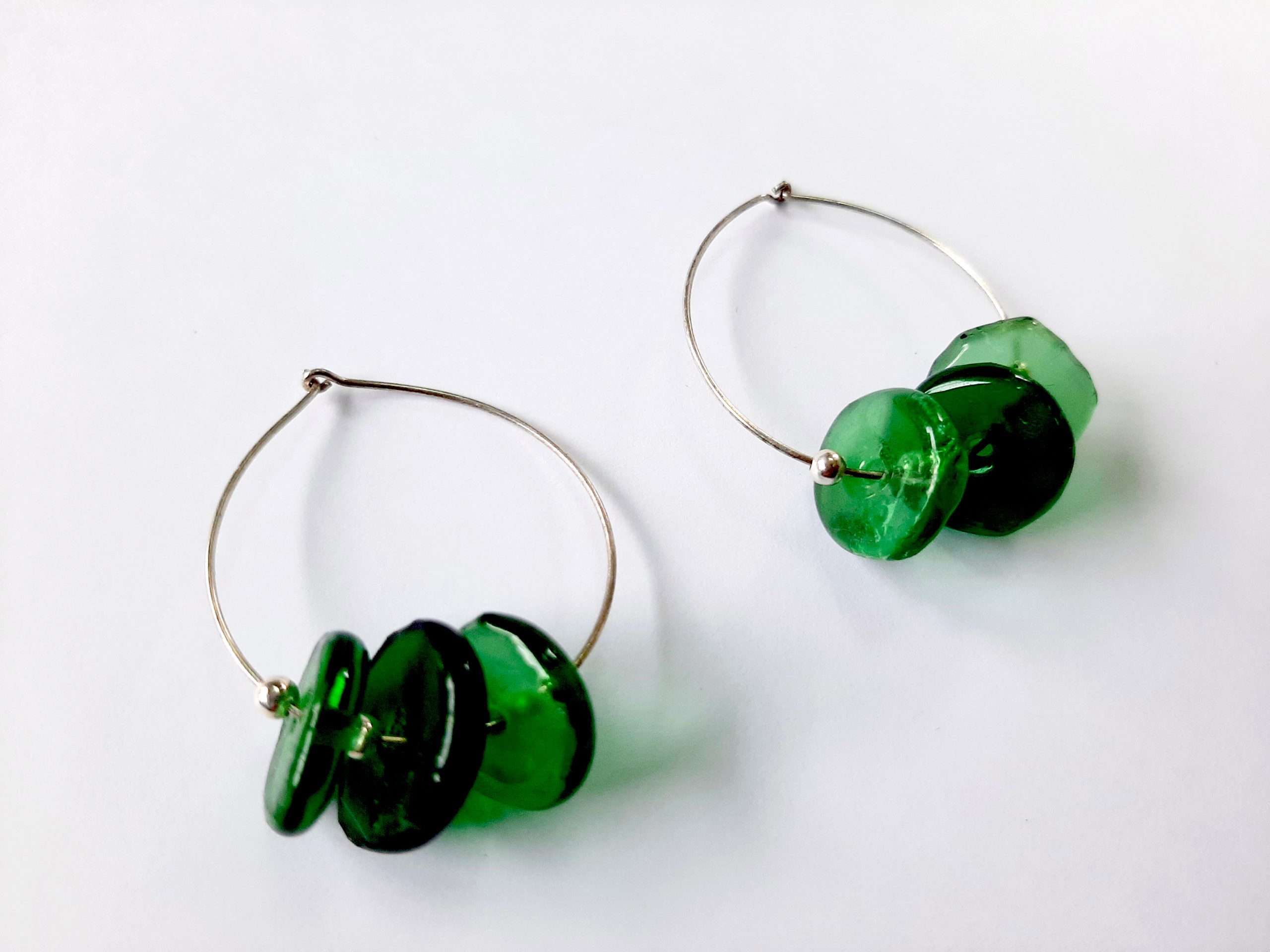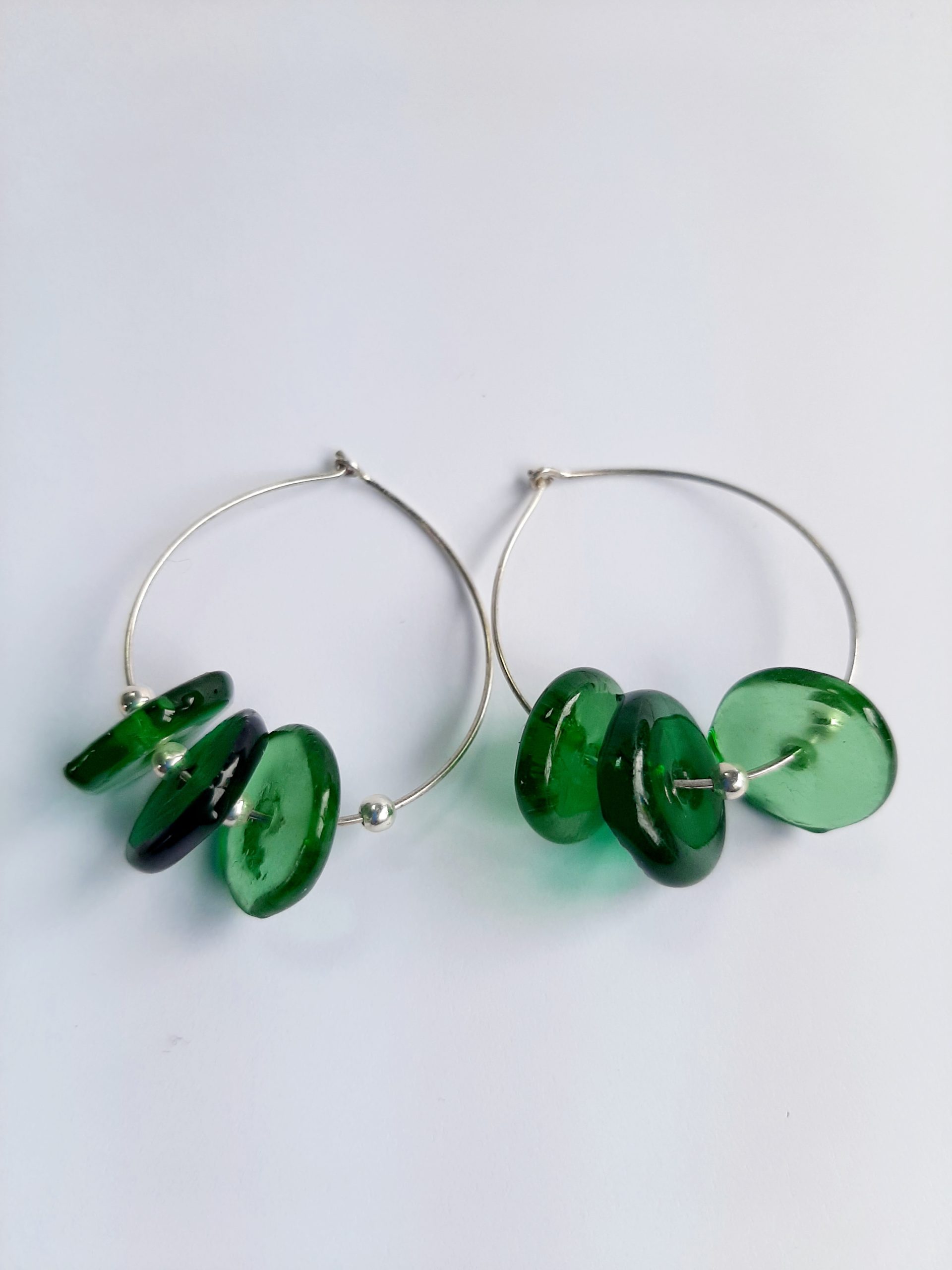Descubre la elegancia y el color de nuestros pendientes hechos a mano. Cada cuenta de vidrio, cuidadosamente agujereada en el centro y separada por una bola lisa de plata, se ensambla en una fina argolla de plata 925. El resultado es una pieza de joyería sofisticada y única que añade un toque de distinción y encanto a tu estilo, perfecta para cualquier ocasión.